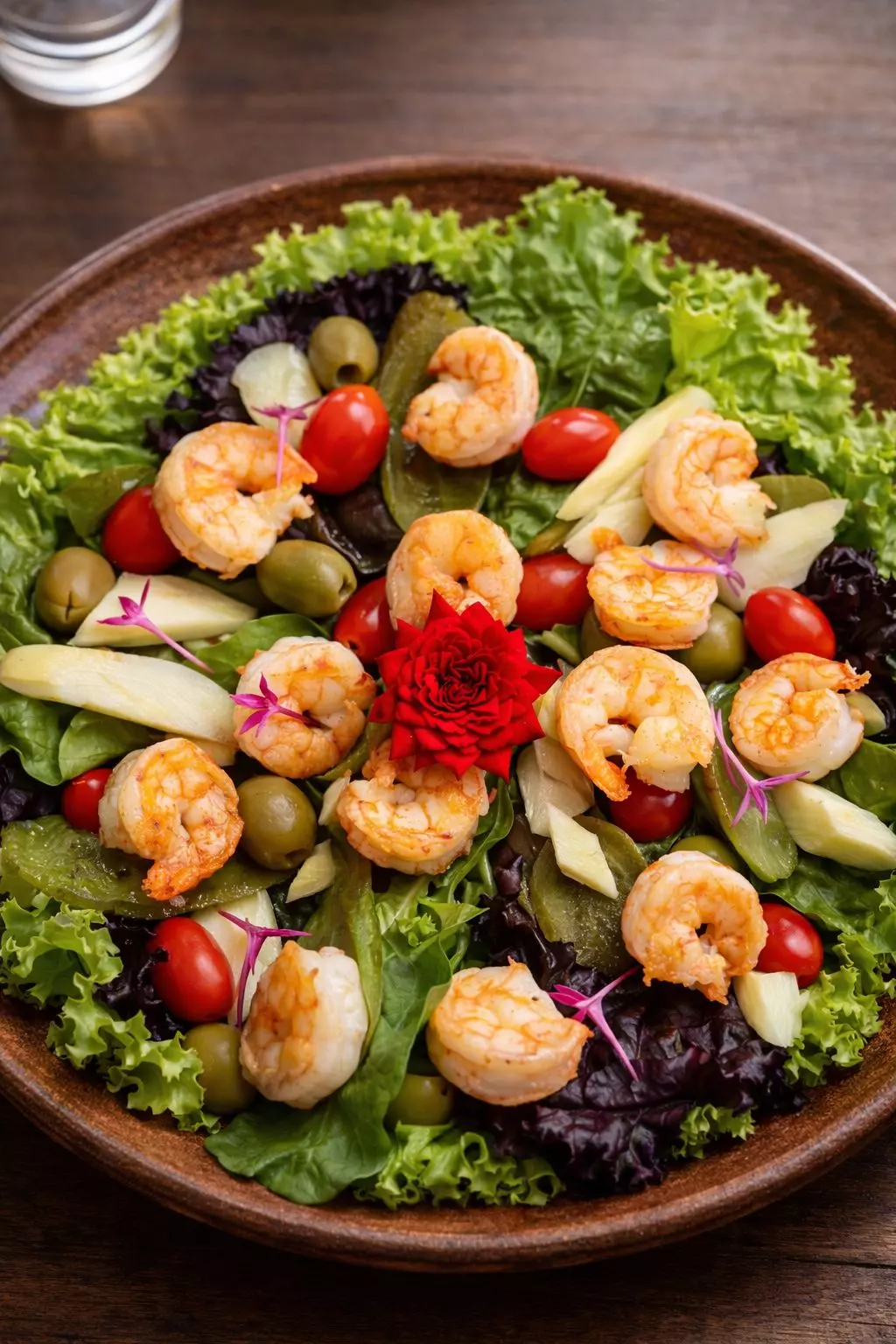 Camarões, mix de folhas (alface americana e romana), tomate cereja, palmito, pepino em conserva e azeitonas.